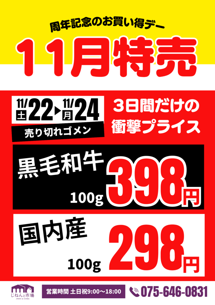 11月22日(土)~24日(月)スペシャルDAY 2025年11月21日(金) [カテゴリー] 取扱い商品, お知らせ, イベント・キャンペーン, 営業カレンダー, イベント, 加工品 いつもご利用ありがとうございます。 11月はじねんと市場創業月。 2025年11月22日(土)~24日(月)の3日間スペシャルDAYを開催します。 ・黒毛和牛 100g当たり398円 ・国内産牛 100g当たり298円 ・3日間限定ポイント5倍デー このほか、農産物も特別価格にて販売予定。 3日間だけの特別企画 皆様、この機会にじねんと市場にご来店ください!! < ホットコーヒー(テイクアウト)始めました!! お正月用丸餅予約受付のご案内 >